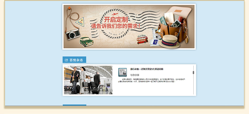 Project Description 百悦逸游于2012年初由二位资深的旅行家创办,是成都传媒集团旗下成都新闻国际旅行社有限公司的高端旅游品牌,总部位于成都高新区天府大道中段美年广场。在百悦逸游成立之前,创始团队亲自到全球三十多个国家实地考察,带着第一手的资讯和执着的信念创立了中国西部第一家真正意义上的私人定制旅行机构。百悦的旅行不是跟团挤大巴,不是十天去十个国家,更不是没完没了的... Official website address 濮阳http://www.100.travel I want to share