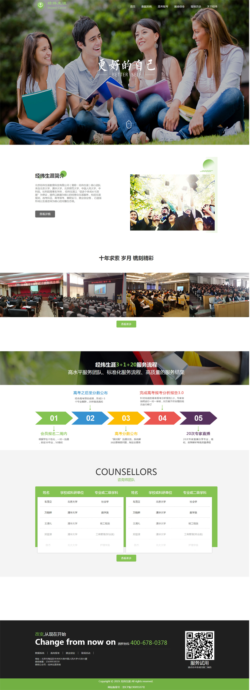 北京经纬生涯教育科技有限公司(简称:经纬生涯)核心团队来自北京大学、清华大学、北京师范大学、中国人民大学、中科院、社科院等著名学府, 经纬生涯以“促进个体成长与发展”为使命,提供以数据为核心的结果化生涯服务,包括生涯规划、选考科目、高考报考、兼职实习、就业创业等, 已逐渐形成以生涯咨询为核心的完整生态链。